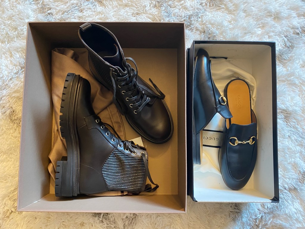 When I looked closer at the shoes because I just couldn’t resist, I found two that I just couldn’t pass up. The first pair I got was the Gucci classic black leather Princetown leather slippers. These shoes are not new, and can be found allll over instagram over the past few years. So many brands have made knock off versions of this shoe. But it’s beauty and craftsmanship still make it stand out from the cheaper version, and I can see myself wearing this shoe for seasons and years to come. They also just seem to fit my feet perfectly, the knock off versions always seem to have an odd fit. I’ve been wanting these shoes for over 4 years but could never justify the price, but for almost 50% off the original price for the exact color and material I wanted I couldn’t pass them up.