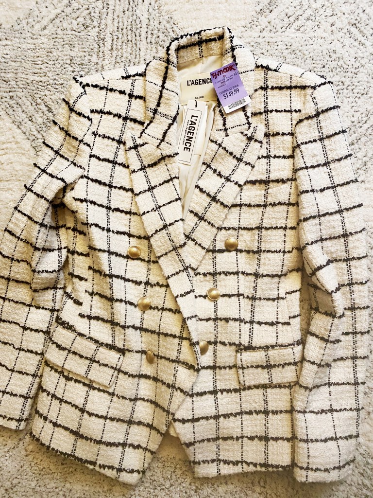 When I was at TJ Maxx, my eye was immediately drawn to a blazer. It had such a “wow” factor about it. Between the print and the gold buttons, it has a slight Balmain vibe about it, but more classic. It’s a timeless style that can be worn dressed up or dressed down, and would be something I could see myself wearing over and over again. Since it’s such a stunning piece, I was a bit nervous to look at the price since I had already fallen in love with it. To my shock, it was priced at $149.99.