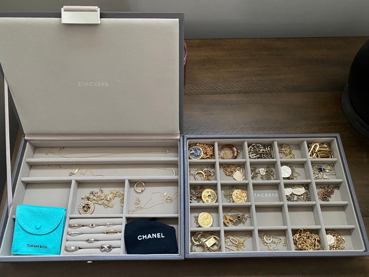 The way Stackers work is just like how you’d expect from the name, you stack different trays based on your needs. They have deep ones that you can put your glasses in, ones that have drawers, different numbers of sections based on what you’re trying to fit. I personally started with the classic lidded jewelry box, and a 25-section tray to go under it. I use the lidded section to store my fine jewelry, and the bottom part to hold my fashion necklaces. The lidded one I can fit my necklaces and rings as there is a ring holder built in, and there are also larger sections that I can keep some sentimental items safe in. The 25 section try is perfect if you have a ton of necklaces without the worry about them getting tangled.