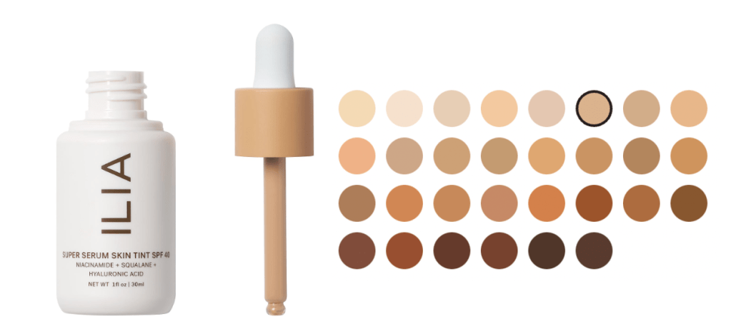 The Ilia Super Serum Skin Tint has SPF 40 in it that helps protect your skin from UVA and UVB, and is also has ingredients that help you improve your skin as well. It contains hyaluronic acid, niacinamide, and plant based-squalene, so it’s skin care, skin protectant, and make up all in one. The packaging is recyclable, and it is vegan, cruelty free, and clean. What more could you want in a product?