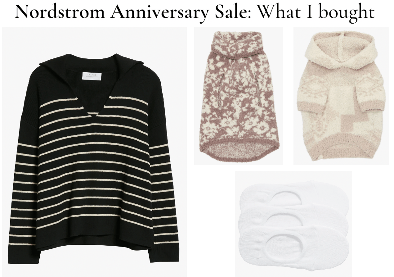 The sweater by La Ligne is the perfect easy sweater to wear to work or the weekends. The collar detail adds a preppy twist to a regular striped sweaters, and the black and tan stripes keeps it neutral and transitional between seasons. Even on sale it’s still a bit of a splurge, but the quality of the sweater is super nice and I know it will be able to wear it season after season. The reviews online complained that the sweater was cropped, but being petite I found it hit me in a great spot on my waist, with the perfect amount to do a front tuck! While not a fun or a glamours purchase, the no show socks are one of the favorite things I bought. They come in a pack of 3, and in 3 different colors so you can pick fits your needs best. I love wearing lower cut sneakers, and these socks don’t slip off during the day which is so hard to find with no shows!! The last thing I purchased was not for me, but rather my dog. I have a smaller dog that gets cold in the winters, and loves to be warm in little sweaters. I saw these Barefoot Dream ones and just couldn’t resist. My intention was to keep only one, but the quality and fit was great, and I know she’ll wear them often once the cold weather hits so it’s worth it to spoil my pup!
