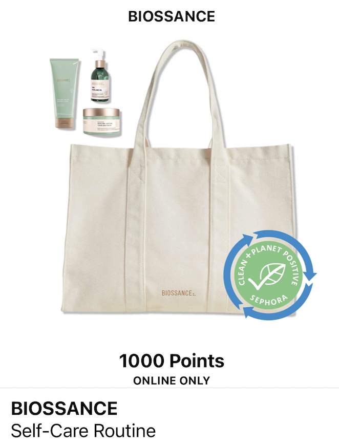 The first set I picked up was the Biossance Self-Care Routine set. It comes with the body scrub, body lotion, a squalene oil, and a tote bag, and all the products are full size! I absolutely love Biossance products, and it being an almost $100 value I thought it was such a great deal. A $100 gift card costs 2500 points, so this to me is almost double the value!