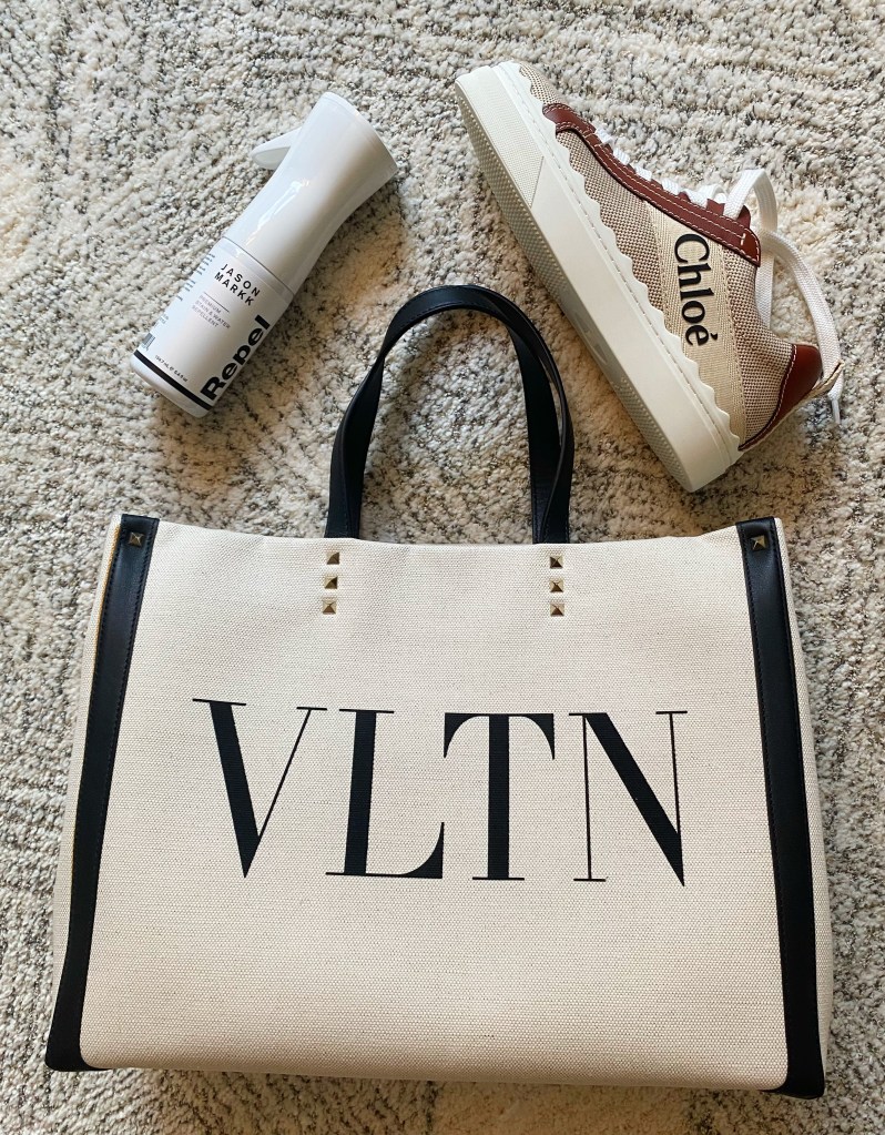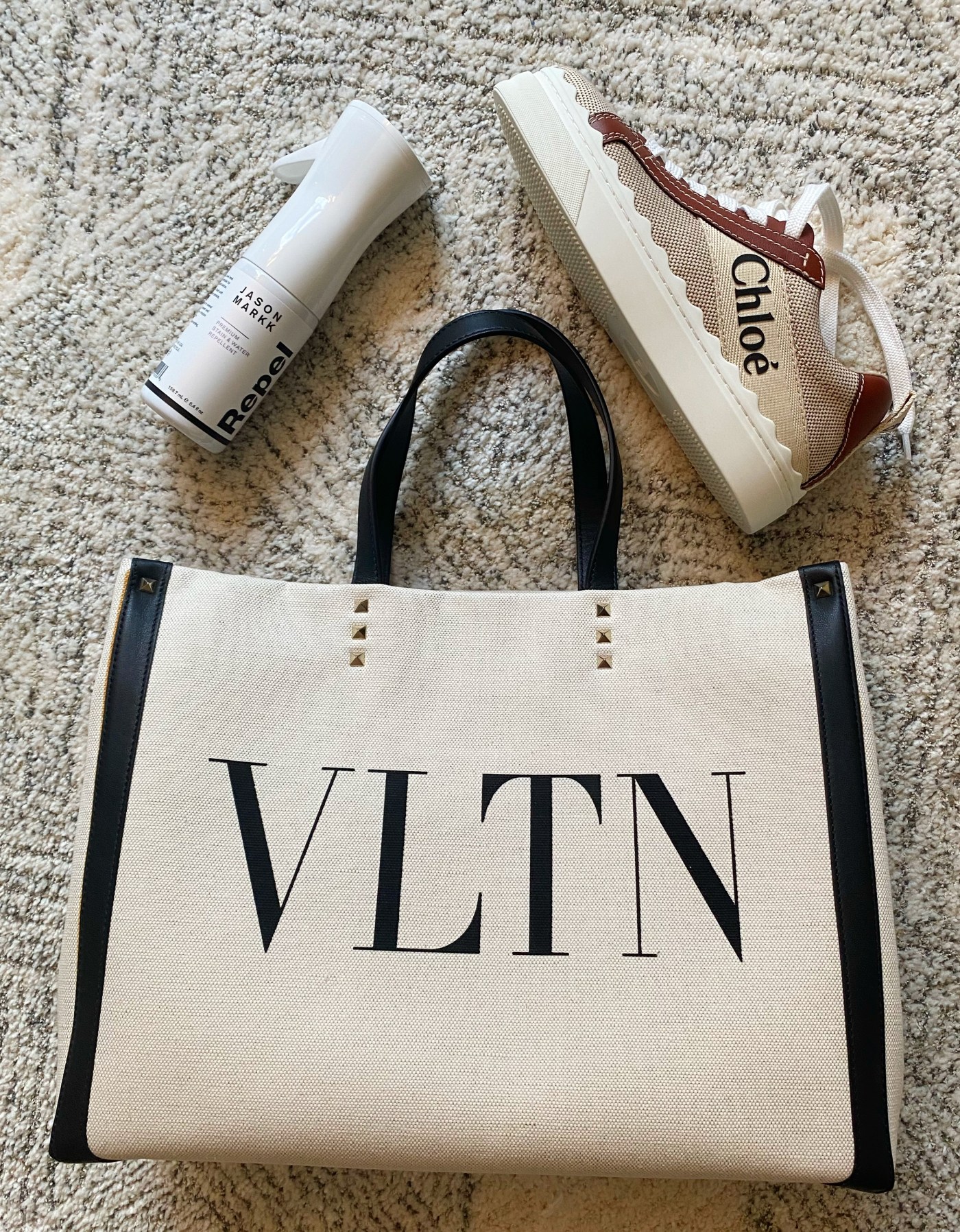 I invest in my wardrobe, and I like to make sure I’m taking care of my items and keeping them in the best shape I can. Certain fabrics like canvas and suede are more delicate than others, and require a little bit more attention. I always clean and out away my bags and shoes when I’m not using them, for bags I stuff them and store them in dust bags, for shoes I clean them off and store them in shoe boxes. For the more delicate/sensitive fabrics, I also like to protect them with a spray to keep them in the best shape. I love using a barrier spray on my canvas and leather bags and leather bags and shoes to help them repel stains and liquids. This is a MUST for me, especially on white or light-colored canvas, and suede and canvas shoes. While it doesn’t give complete protection, it definitely helps keeps your items much more protected.